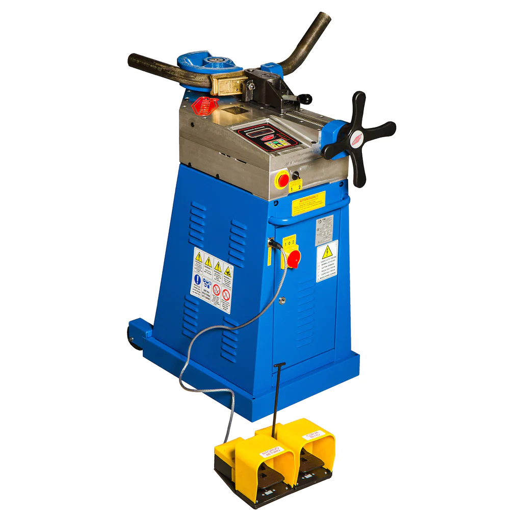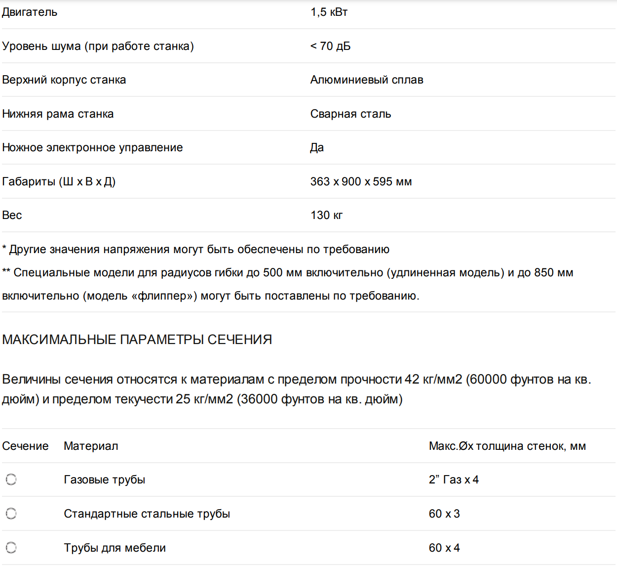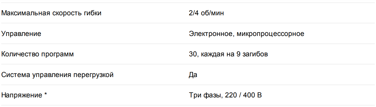 - Электронная микропроцессорная система управления, включающая 30 различных программ. В каждом режиме оператор может выбрать до 9 углов загиба и коррекцию угола упругости, которая характеризует предел прочности материала трубы. Память системы работает от встроенного питания.