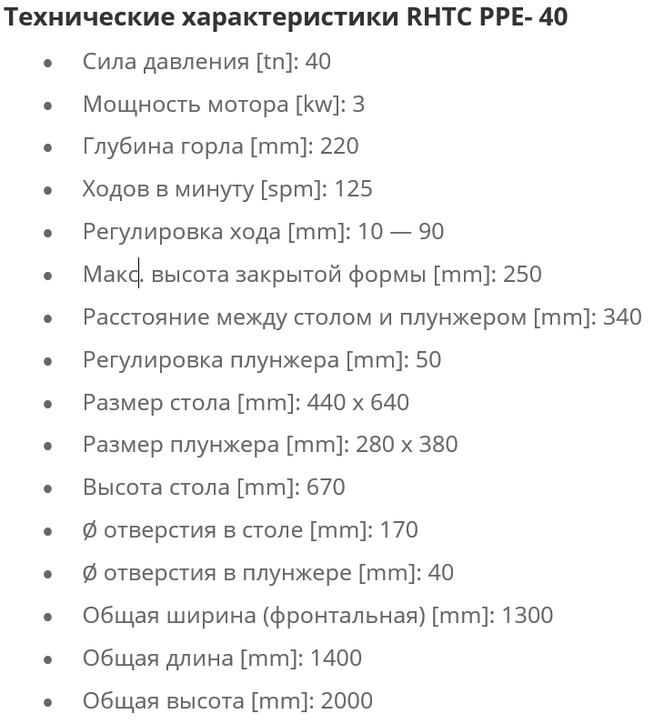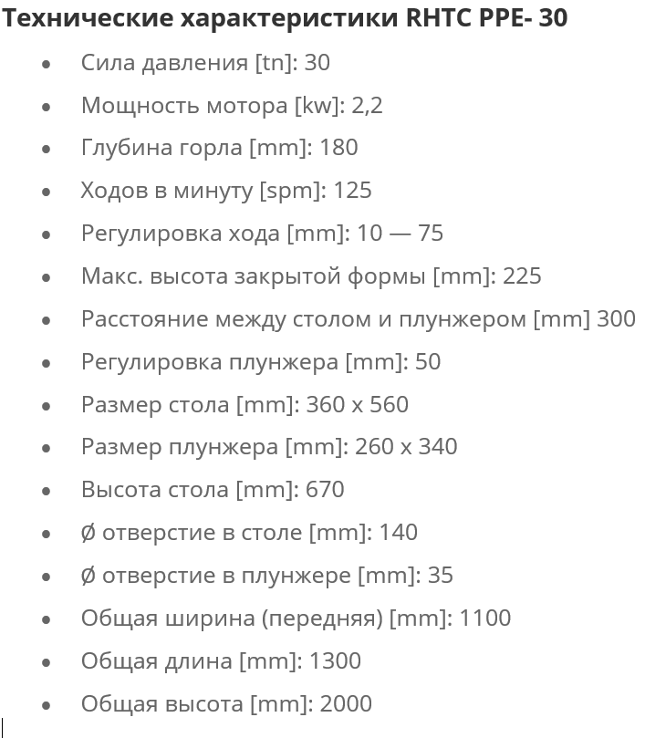 Серия RHTC PRE предлагает пресса следующего усилия: 30, 40, 600, 80, 100, 125, 160, 200, 315 тонн.